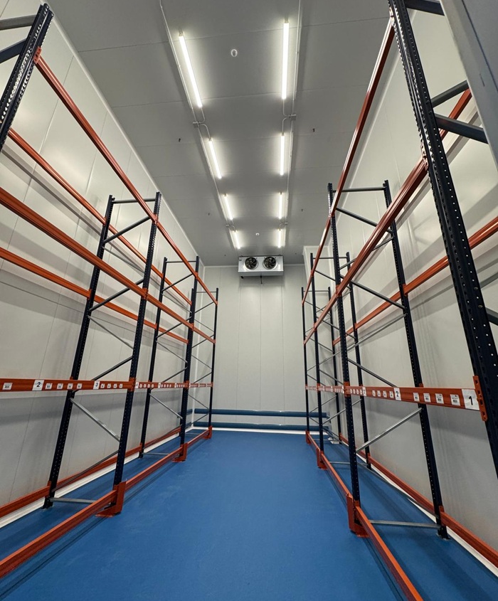 Una de las cámaras tiene una altura de casi 8 metros con distintos encastres interiores de las vigas diagonales de la nave, para ganar metros residuales de almacenamiento sin perder eficiencia. Esta cámara lleva una puerta corredera automática con sensor de entrada para contribuir a gestionar el acceso con rapidez y seguridad.