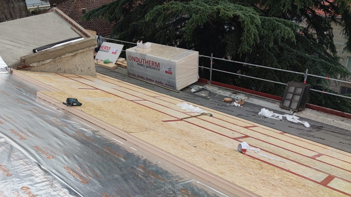 - Instalación de la barrera de vapor: la lámina ONDUTISS® BARRIER se instaló directamente sobre el soporte, fijada mecánicamente y solapada mediante las marcas impresas en el propio producto, garantizando: